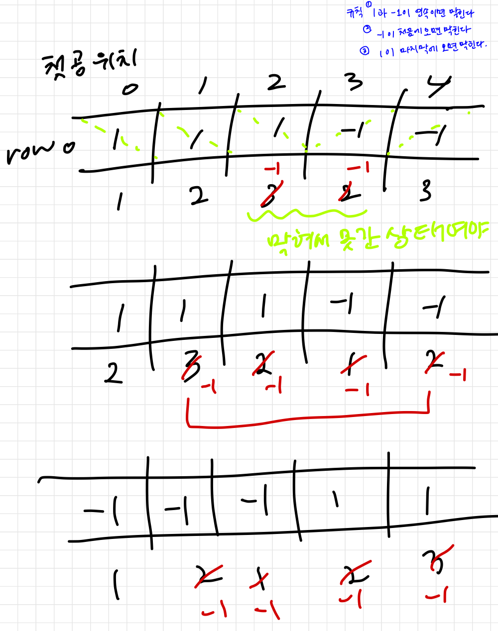 - 공이 아래로 흘러갈 때 1과 -1이 연속으로 나오면 길이 막힌다.