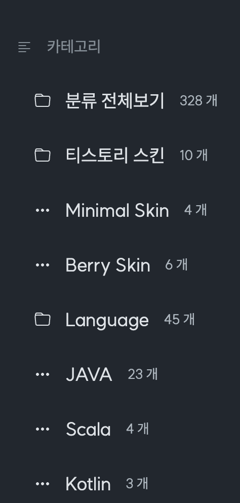 스킨을 적용하고 카테고리 마진도 조금 수정했다. Bluemiv 님이 올려주신 스킨 그대로 사용하면 왼쪽 사진처럼 폴더와 그 밑의 분류가 마진 없이 보여지는데 하위 분류를 확실하게 보여주고 싶어서 마진을 줘서 오른쪽 사진처럼 바꿔봤다.