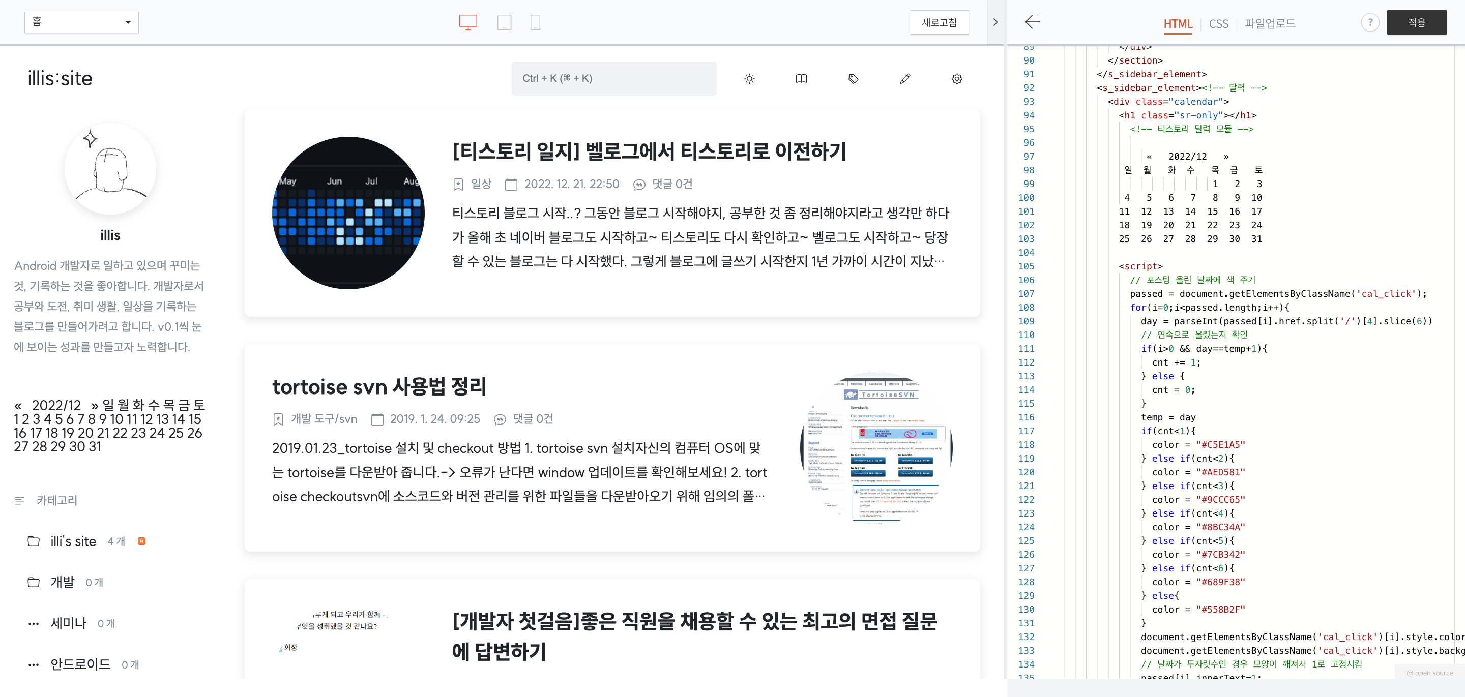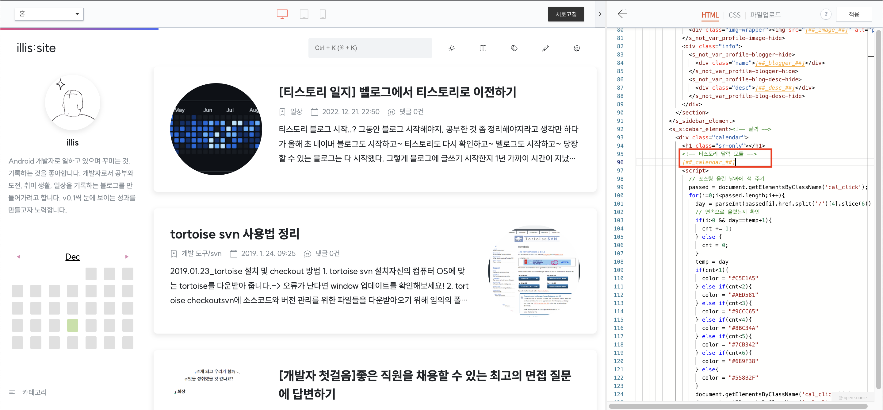 스킨을 수정할때와 마찬가지로 티스토리 블로그 설정 > 스킨 편집 > html 편집 에서 올려주신 코드를 적용하면 되고 적용한 화면은 아래와 같다. 처음에는 프로필 바로 밑에 적용해보려고 했는데 이해를 못해서 약간 헤맸다.