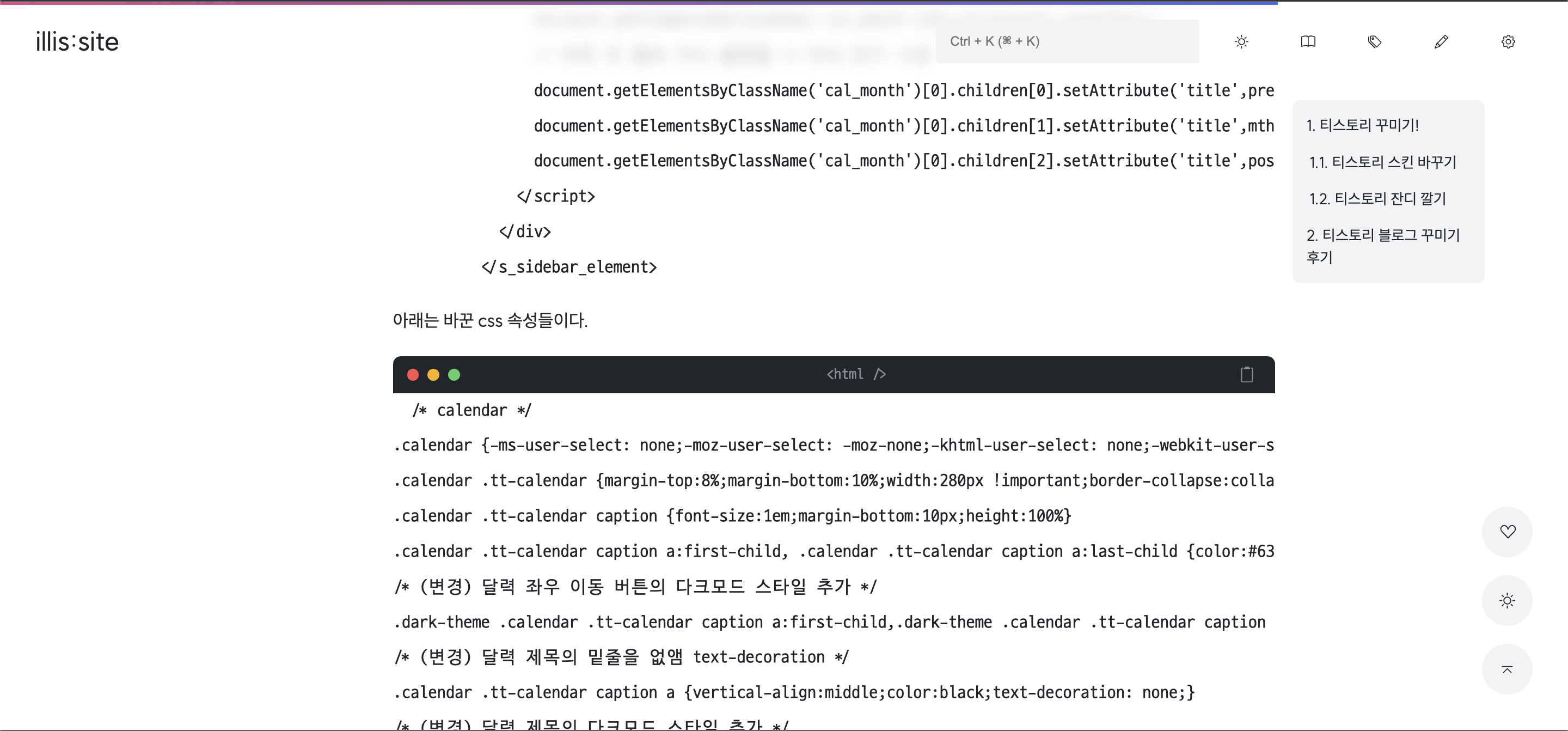 똑같이 적용하고 싶은 분들이 있다면 티스토리 블로그 설정 > 스킨 편집 > html 편집 > css 에서 아래 내용을 수정하면 될 것 같다.