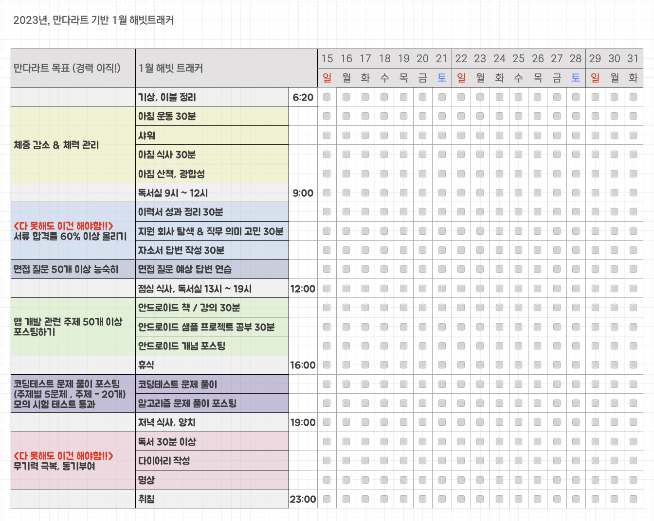 만다라트를 작성하고 나니 이 만다라트를 기준으로 해빗트래커도 채워봐야겠다는 생각이 들었다. 1월 둘째주부터는 수정된 해빗트래커로 내용을 채워봐야겠다.