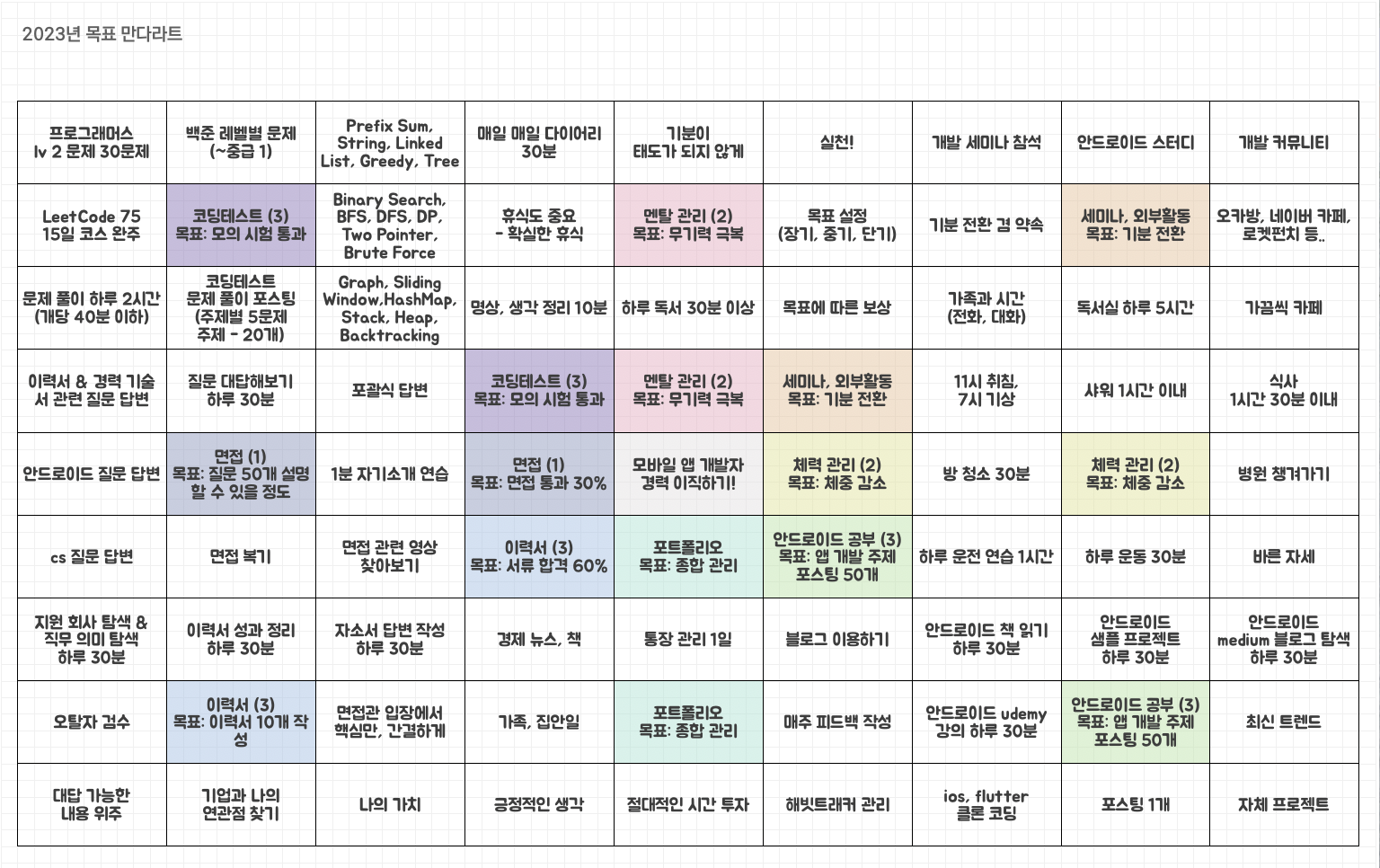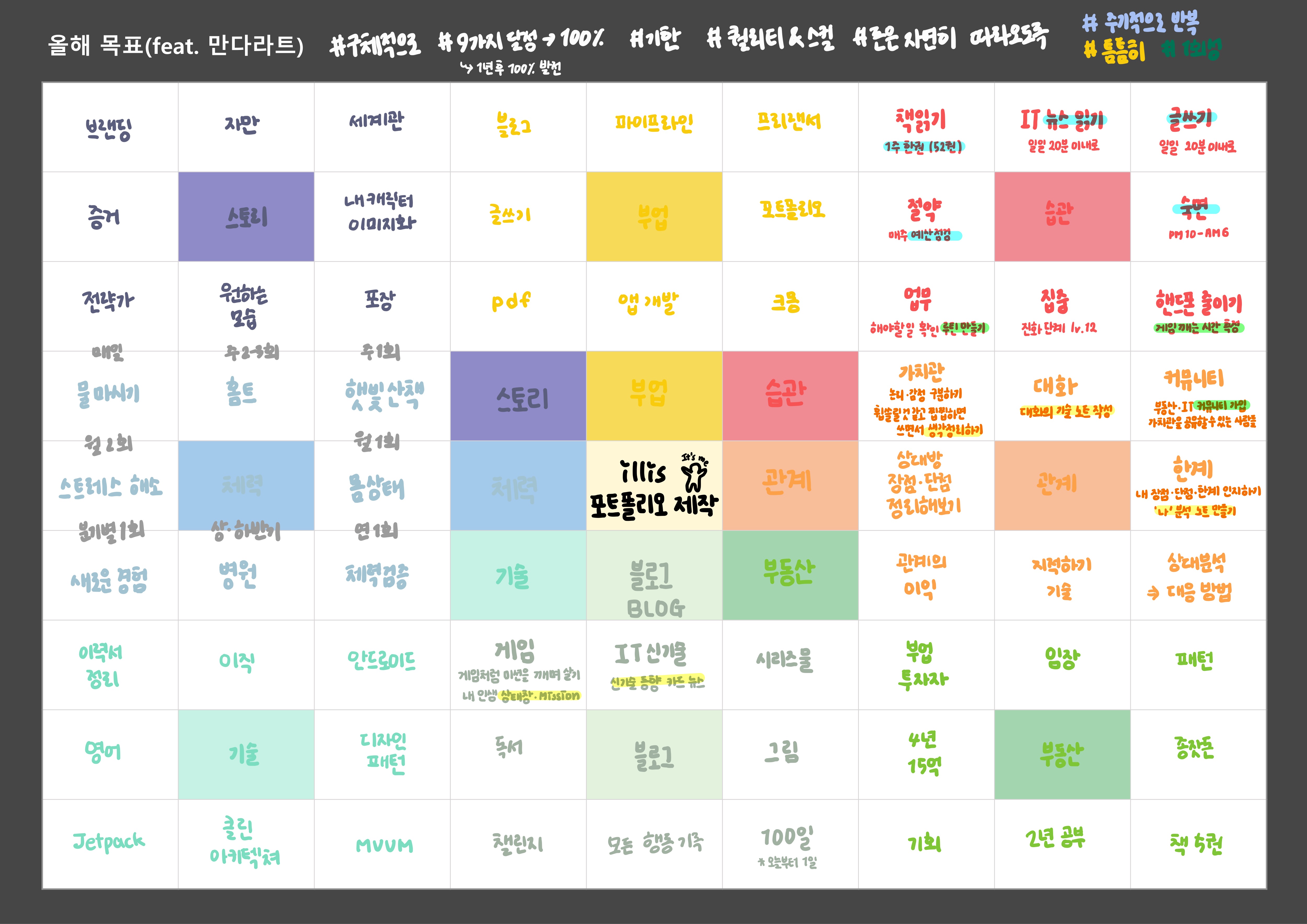 작년에도 만다라트를 작성했었는데 작년에는 목표가 명확하지 않다보니까 만다라트를 추상적으로 채웠던 것 같아서 올해는 구체적인 목표에 대한 만다라트를 작성해봤다.