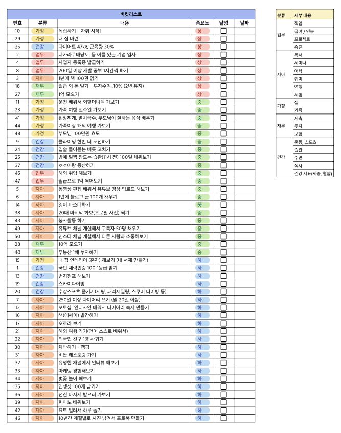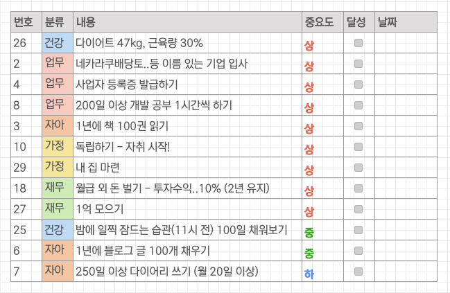 업무, 자아, 가정, 재무, 건강 목표 5가지로 분류해서 작성했고 내 나름대로의 중요도를 매겨봤다. 구글 스프레드 시트로 작성했는데 분류별(왼쪽)로 구분해서 내용을 확인할 수도 있고 중요도 순(오른쪽)으로 나열해서 볼 수도 있어서 좋았다.